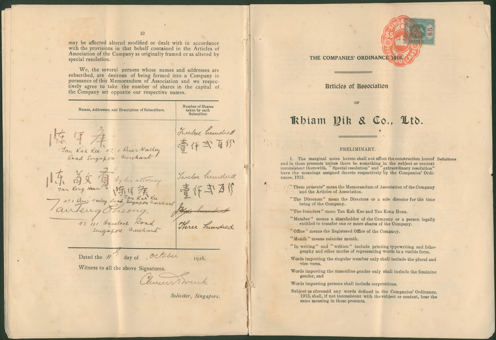 陈嘉庚谦益公司注册资料 一级文物 1916年 黄兴捐赠 中国华侨历史博物馆藏 著名侨领陈嘉庚先生创办谦益公司时的公司注册文件,内有陈嘉庚(当时用名“陈甲庚”)及其弟陈敬贤的亲笔签名。 ![]()