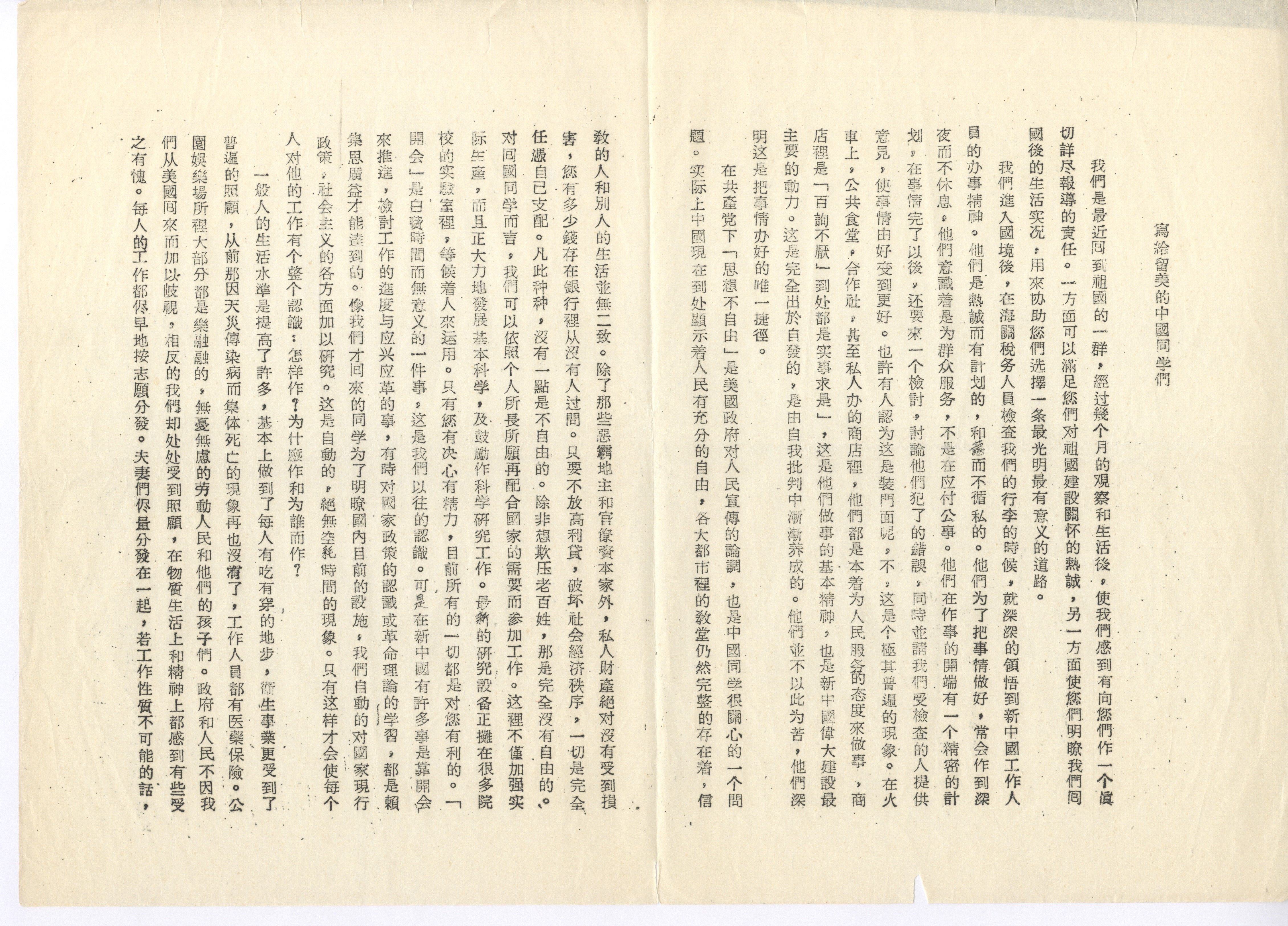 “写给留美的中国同学们”回国倡议书