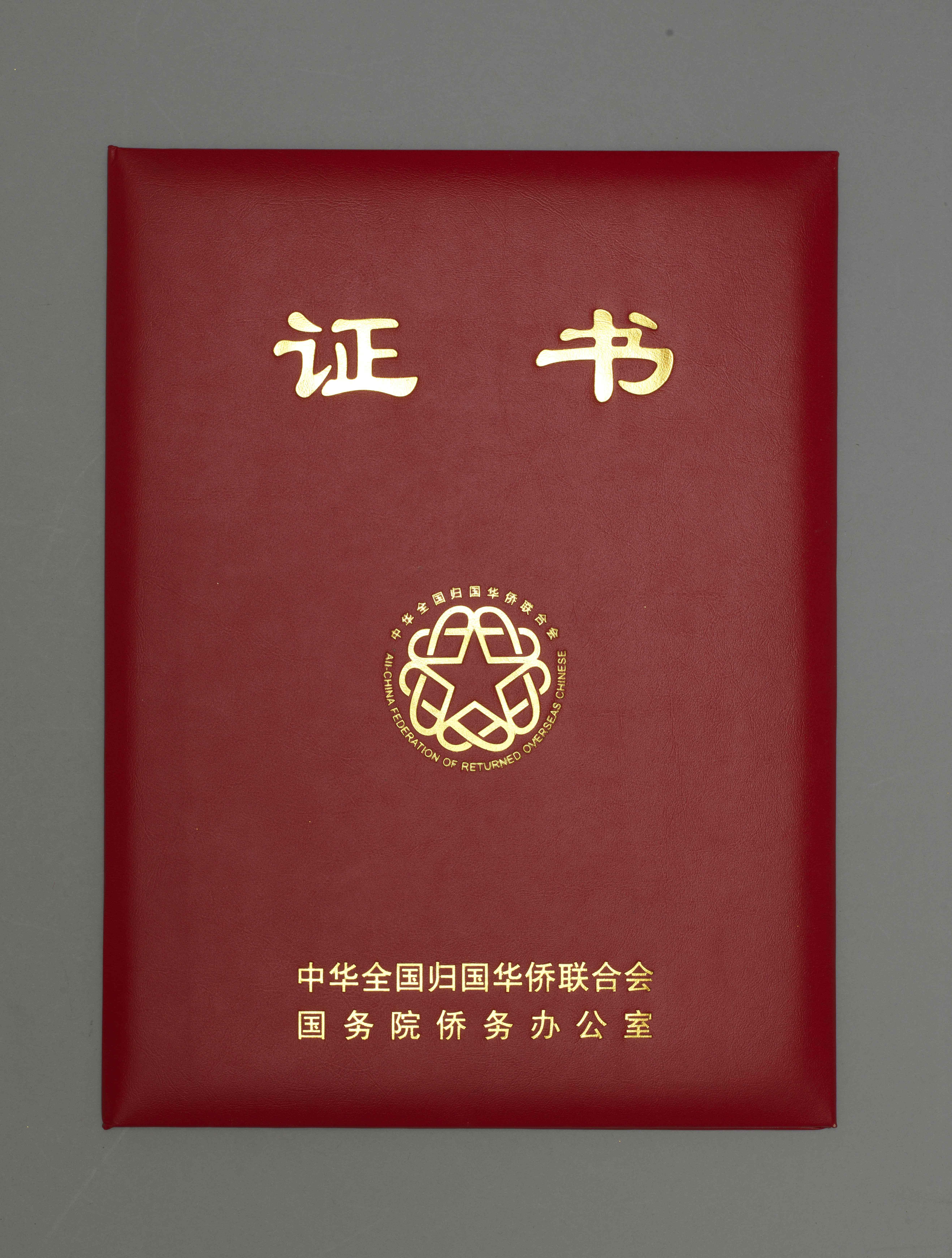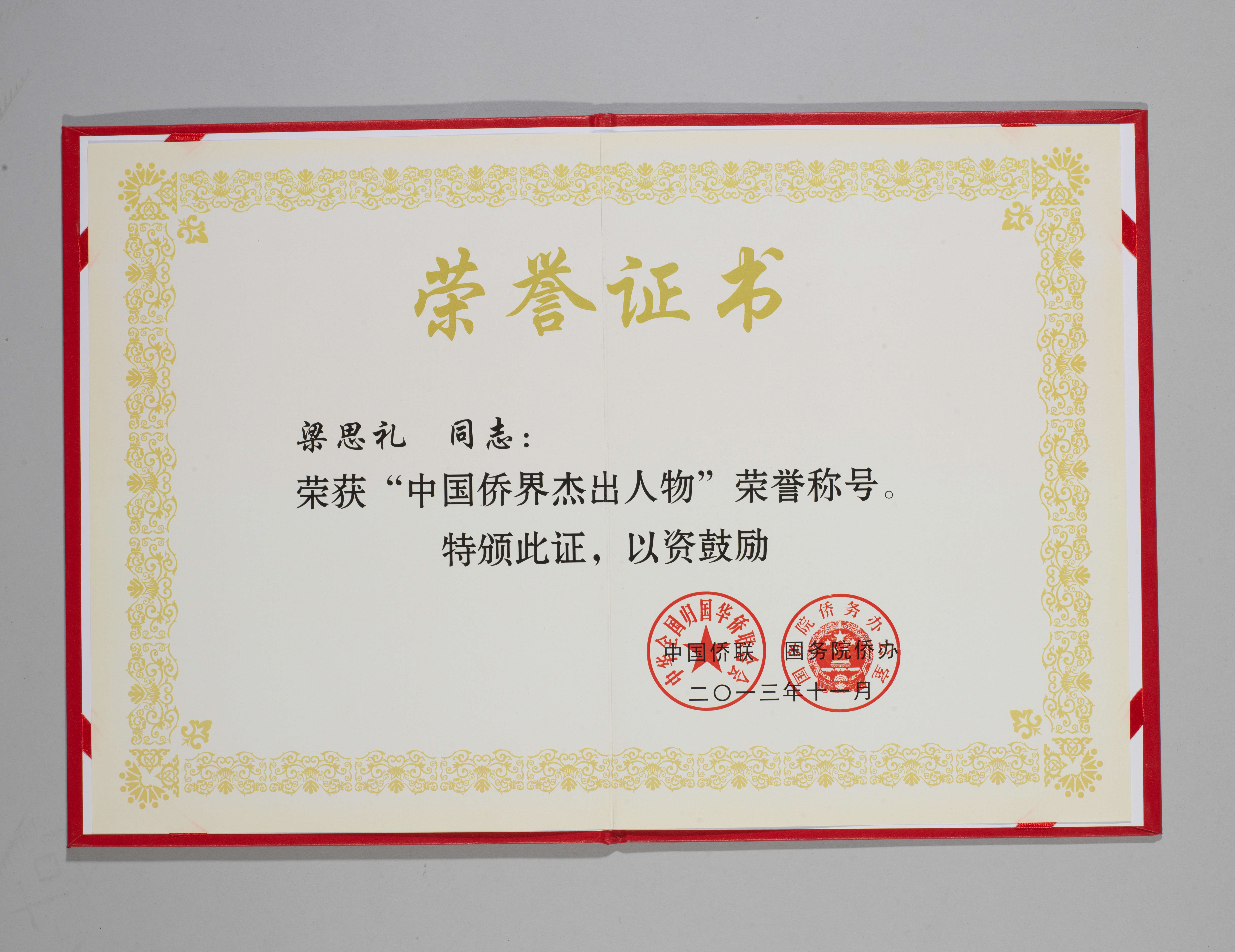 梁思礼所获“中国侨界杰出人物”荣誉证书